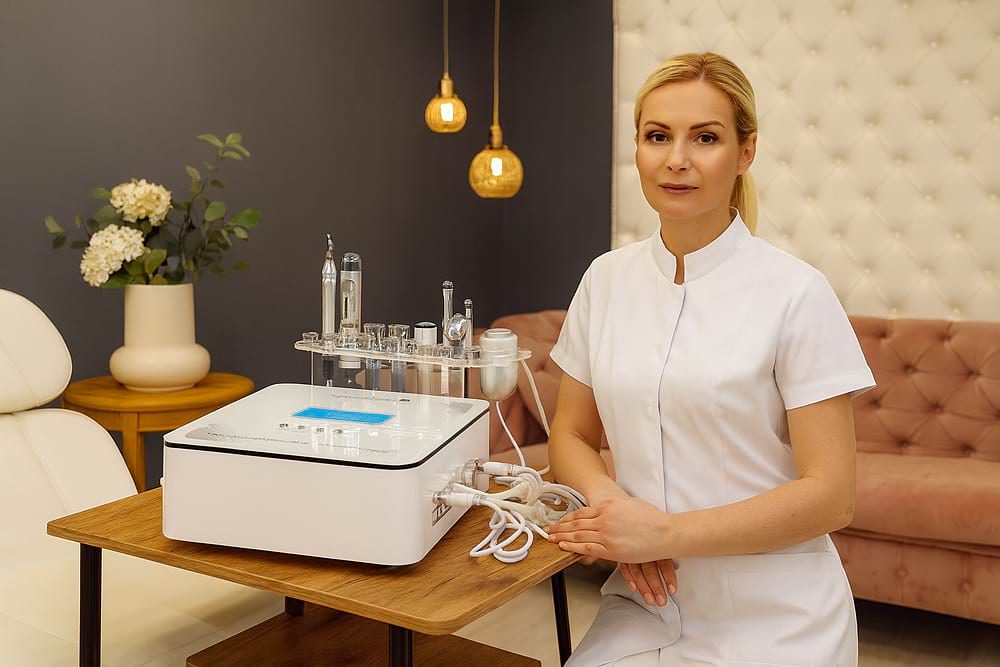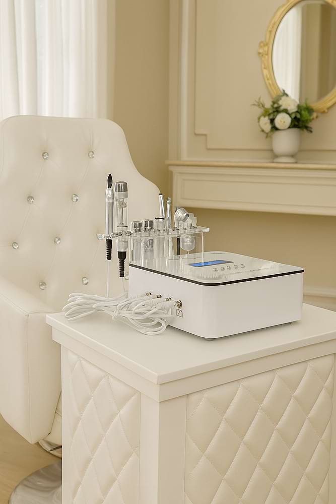 Diamantová mikrodermabraze s vakuovým sáním. Možnost výběru z 9 aplikačních korunek s různou hrubostí a velikostí průměru. Velký výběr aplikačních korunek umožňuje snadné ošetření klientů s různými typy pleti. Dostatečně dlouhá vzduchová hadice pro snadnou manipulaci. Extrémně dlouhá životnost abrazivních korunek. Obroušení odumřelých kožních buněk a reziduí. Odstranění velice drobných částeček makeupu, které ulpí v kožních pórech. Hloubkový peeling pleti. Uvolnění kožních pórů. Prevence proti tvorbě akné. Podpora krevního oběhu. Vyrovnání barevného tonusu pleti. Zvýšení elasticity pleti. Stimulace kolagenních a elastických vláken. Mechanická masáž pokožky.