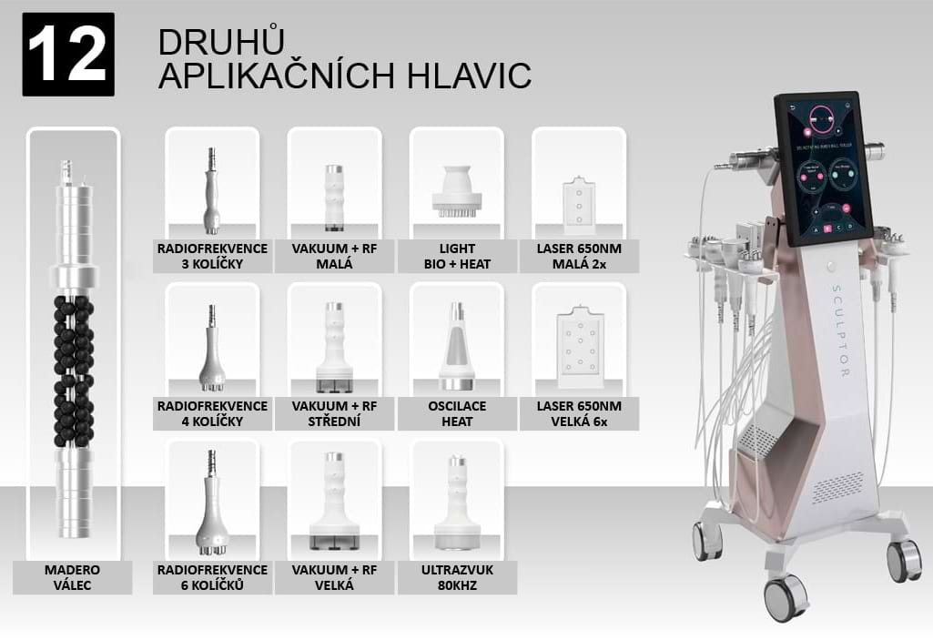 - 🧠 Technologie: radiofrekvence, vakuová masáž (podtlak), light bio heat (vyhřívání), ultrazvuková kavitace, laserové světlo, elektroforéza, vibrační oscilace, robotická maderoterapie